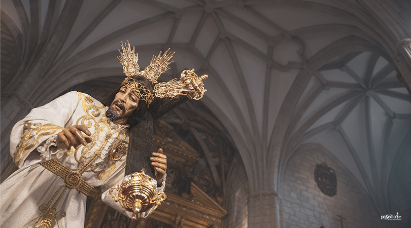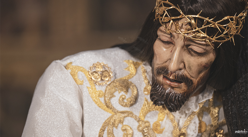 Entre los estrenos, destaca especialmente la nueva túnica de salida del Cristo de la Crucifixión, realizada en el taller de Jesús Rosado Borja, en oro fino sobre terciopelo de seda en color blanco hueso, con diseño de estilo clásico y simbología alusiva a la Pasión.