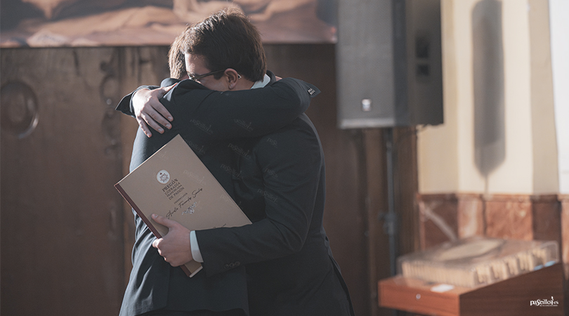 El encargado de presentar al pregonero fue su propio hijo, Aurelio Fernández Sánchez, quien ofreció un emotivo discurso en el que repasó la trayectoria personal, profesional y cofrade de su padre. Durante su intervención evocó su infancia ligada al convento franciscano, la profunda devoción familiar y la intensa relación del pregonero con la santería y con distintas hermandades lucentinas, subrayando especialmente su vinculación con la Cofradía Franciscana de Pasión y con la Virgen de la Pasión.