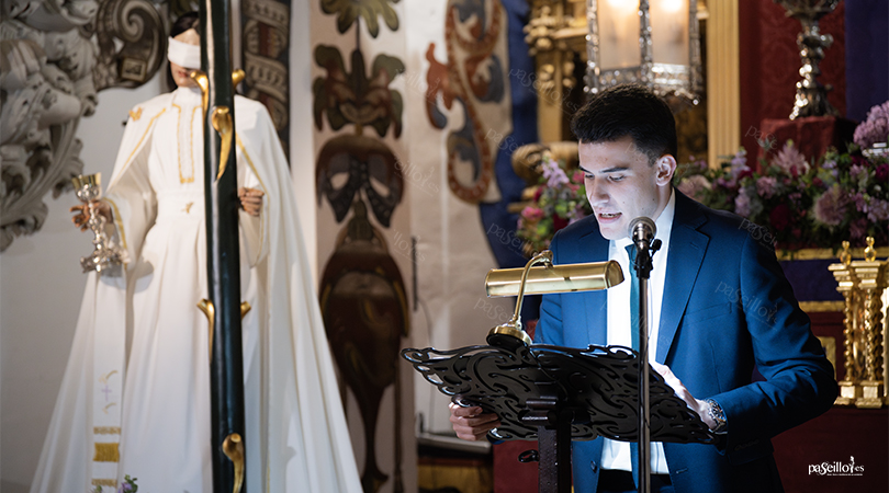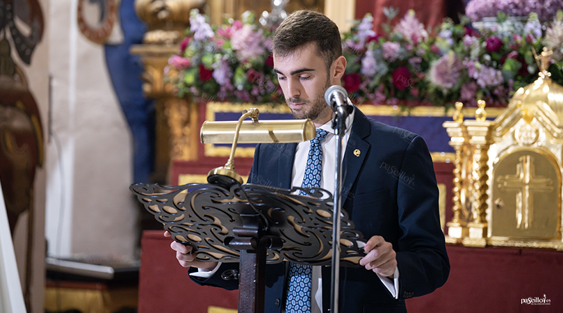 La presentación estuvo a cargo de Álvaro Caballero Henares, quien trazó un perfil humano y cofrade del pregonero, subrayando su juventud, su formación en Periodismo y Comunicación Audiovisual y su consolidada trayectoria en la oratoria cofrade. Lo definió como un joven “de entrega absoluta”, cuya fe encuentra en la palabra su mejor expresión.