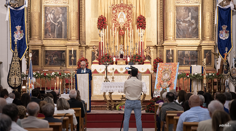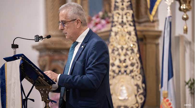 La presentación del pregonero corrió a cargo de Araceli Pérez López y Beatriz Pérez López, quienes destacaron su trayectoria personal, profesional y cofrade, subrayando su condición de docente, servidor público y hombre de profunda fe, así como su consolidada experiencia como orador en distintos pregones. Durante la introducción, se puso en valor su capacidad para transmitir emoción y devoción a través de la palabra, definiéndolo como una figura profundamente comprometida con la Virgen.