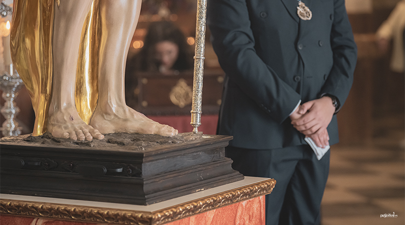 Para esta ocasión, el equipo de mayordomía ha dispuesto un montaje novedoso y de gran fuerza visual, situando a las imágenes a la entrada del templo, sobre pedestales de madera, de forma que quedan plenamente visibles para todos los fieles que acceden por la puerta principal.